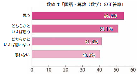 「思う」と回答した児童生徒の国語・算数(数学)の正答率(54.5%)は、「思わない」と回答した児童生徒の正答率(40.3%)と14.2%も開きが生じていることが分かります。