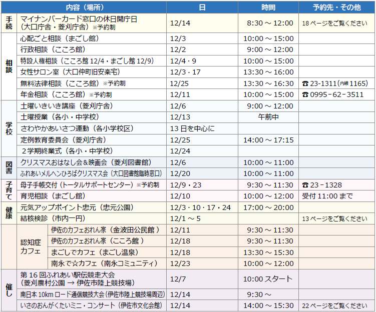 くらし 12月暮らしのカレンダー 31/34 前の記事 次の記事 発行日 : 2025年11月15日 自治体名 : 鹿児島県伊佐市 広報紙名 : 広報いさ 2025年11月15日号 こころ館:大口元気こころ館 まごし館:菱刈総合保健福祉センター 南永コミュニティ:南永校区コミュニティセンター Tweet シェアする 広報いさ 広告募集 12月休日の当番医
