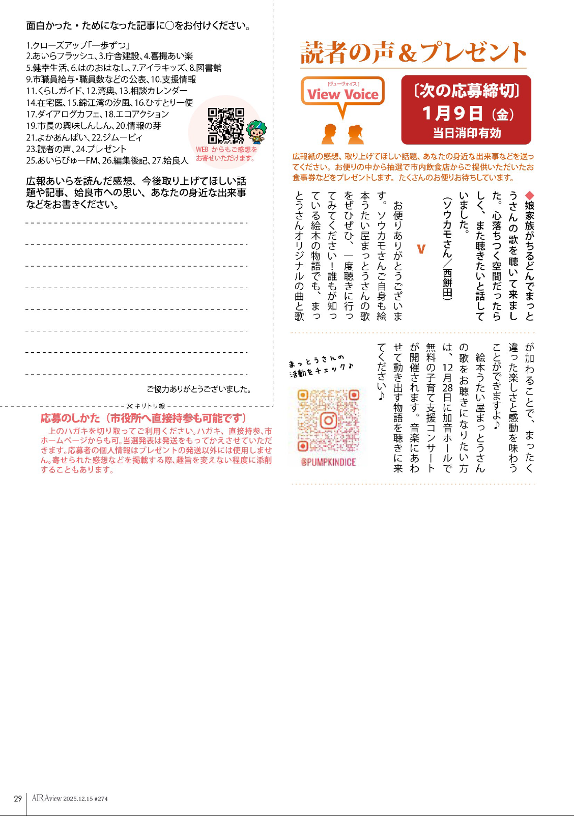 その他 広報あいら「AIRAview」 令和7年12月15日 第274号 29面 29/31 前の記事 次の記事 発行日 : 2025年12月15日 自治体名 : 鹿児島県姶良市 広報紙名 : 広報あいら「AIRAview」 令和7年12月15日 第274号 Tweet シェアする 広報あいら「AIRAview」 令和7年12月15日 第274号 28面 広報あいら「AIRAview」 令和7年12月15日 第274号 30面