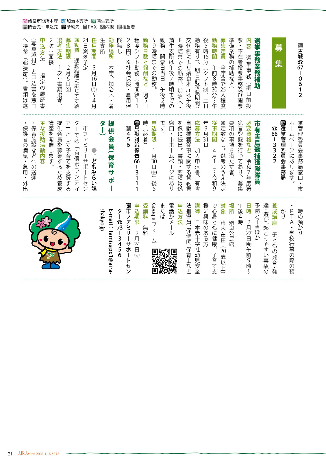 くらし 広報あいら「AIRAview」 令和8年1月15日 第275号 21面 21/31 前の記事 次の記事 発行日 : 2026年01月15日 自治体名 : 鹿児島県姶良市 広報紙名 : 広報あいら「AIRAview」 令和8年1月15日 第275号 Tweet シェアする 広報あいら「AIRAview」 令和8年1月15日 第275号 20面 広報あいら「AIRAview」 令和8年1月15日 第275号 22面