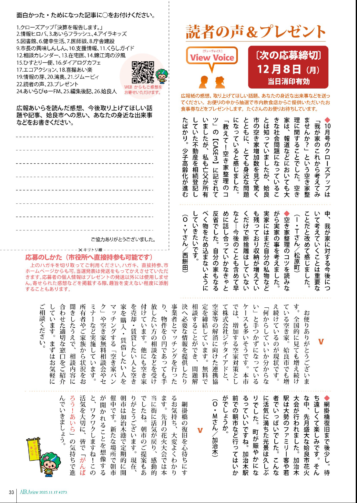 その他 広報あいら「AIRAview」 令和7年11月17日 第273号 33面 33/35 前の記事 次の記事 発行日 : 2025年11月17日 自治体名 : 鹿児島県姶良市 広報紙名 : 広報あいら「AIRAview」 令和7年11月17日 第273号 Tweet シェアする 広報あいら「AIRAview」 令和7年11月17日 第273号 32面 広報あいら「AIRAview」 令和7年11月17日 第273号 34面