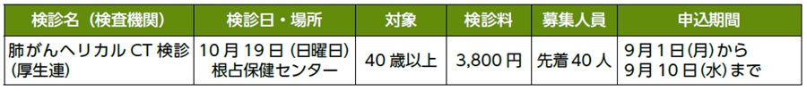 ※8月に実施した肺がん検診を受診された方は、重複となるため肺がんヘリカルCT検診は受診できません。
