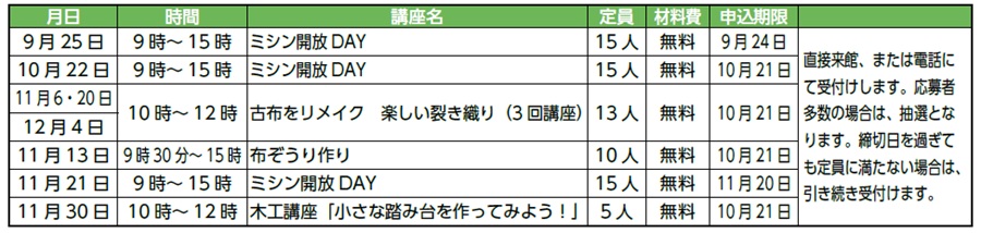 内容:Tシャツリメイク「縫わない簡単エコバッグ」(申込締切…9月24日)