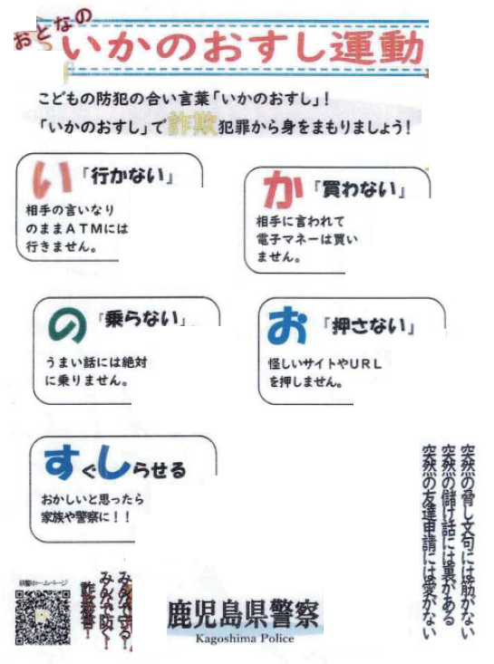 8⽉15⽇(⾦)に、⿅児島相互信⽤⾦庫⾼⼭⽀店で、肝付警察署員と地域安全モニターでうそ電話詐欺被害防⽌キャンペーンを実施し、うそ電話詐欺被害防⽌ティッシュと「おとなのいかのおすし運動」のチラシを配布し、被害防⽌を呼びかけました。