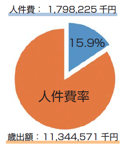 町の歳出額に対し、⼈件費が占める割合は前年度より0.3%⾼い15.9%です。