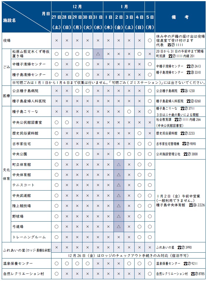 くらし 年末年始の町公共施設休館のお知らせ 6/28 前の記事 次の記事 発行日 : 2025年11月25日 自治体名 : 鹿児島県中種子町 広報紙名 : 広報なかたね 令和7年(2025)12月号 記載内容: ○…開庁・開館 ×…閉庁・閉館 △…条件付き開庁・開館 お問い合わせ先:上表の備考欄に記載しています。お問い合わせは開庁・開館日にお願いします。 Tweet シェアする 県下一斉国保税滞納整理強化月間について 種子島子牛せり市