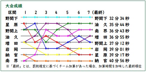 1区の小学生男子は、野間下校区が1位で襷を繋ぎ、先頭を譲ることなくゴールし、大会3連覇を果たしました。