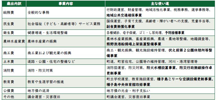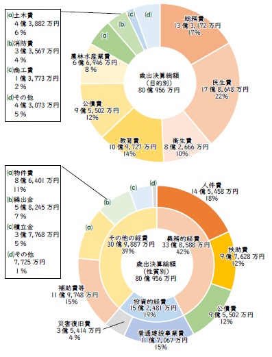 歳出については、教育費が2億5,900万円(同30.9%増)、土木費が1億650万円(同32.0%増)増加した一方、農林水産業費が4億4,649万円(同40.0%減)、総務費が7,728万円(同5.5%減)の減少となりました。主な増減としては、種子島中央体育館改修事業による教育費の増加、町道の改良舗装事業、自然災害防止事業による土木費の増加、砂糖製造業省力化施設等整備事業の完了による農林水産業費の減少、再編交付金事業基金積立金による積立金の減少が挙げられます。
