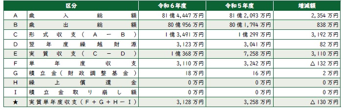 歳入総額81億4,447万円(前年度比0.3%増)、歳出総額80億956万円(同0.1%減)となり、差引額から翌年度への繰越財源や財政調整基金への積立金などを加味した実質単年度収支は3,128万円の黒字となりました。