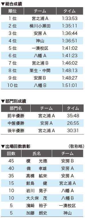 総合成績では、宮之浦Aチームが2年ぶりの優勝を果たしました。閉会式では、入賞チームや区間賞選手への表彰、また特別賞として3人以上の家族で出場したファミリー賞や出場回数表彰が行われました。