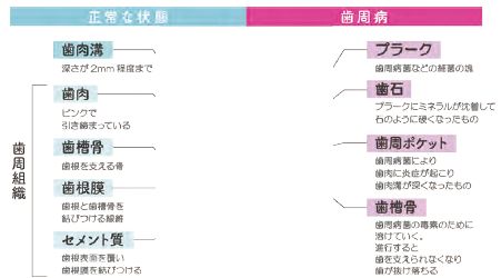 歯と歯茎の境目に溜った汚れ(プラーク)の中で細菌が増殖し、歯肉に炎症を起こし、そのままの状態が続くと、歯を支えている骨を溶かし、最終的には歯が抜けてしまう病気です。