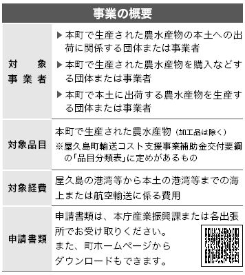 町内で生産された農水産物を本土へ出荷する際に、町では、流通条件の不利性を軽減し、本土産地と均衡ある環境を整備することを目的として、「屋久島町輸送コスト支援事業(特定有人国境離島地域社会維持推進交付金事業)」を行っています。