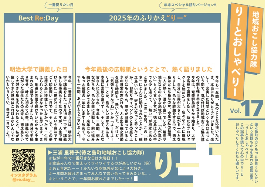 くらし 地域おこし協力隊 りーとおしゃべりー 6/30 前の記事 次の記事 発行日 : 2025年12月01日 自治体名 : 鹿児島県徳之島町 広報紙名 : 広報徳之島 令和7年12月号 Tweet シェアする まちの話題 満75歳以上の方へ、町内区間のバス運賃全額助成のお知らせ