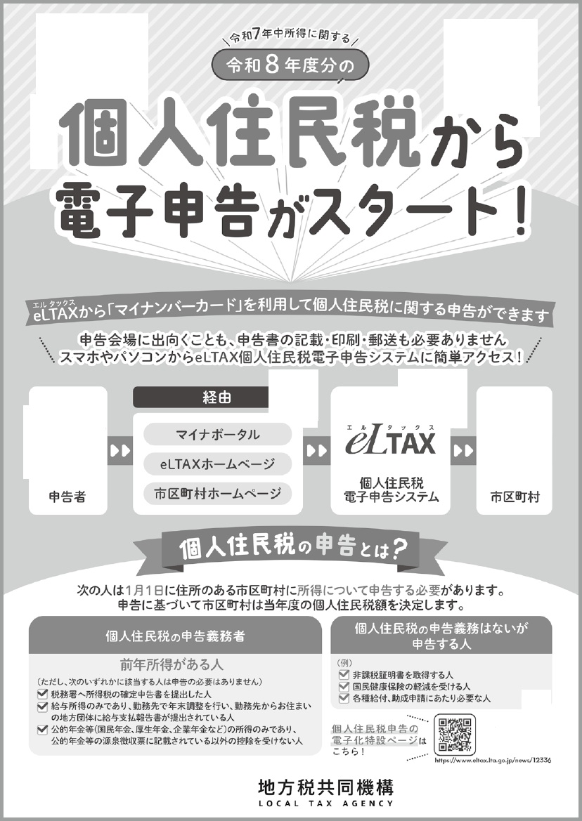 くらし 令和7年中所得に関する令和8年度分の個人住民税から電子申告がスタート! 16/30 前の記事 次の記事 発行日 : 2025年12月01日 自治体名 : 鹿児島県徳之島町 広報紙名 : 広報徳之島 令和7年12月号 Tweet シェアする 児童・生徒の保護者の方へ スマホ等利用に関するアンケート結果について 戦没者のご遺族や旧軍人の皆様へ~移動援護相談のご案内~