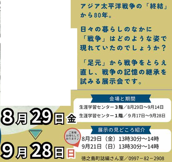 文化 戦後80年企画展 暮らしのなかの戦争 4/27 前の記事 次の記事 発行日 : 2025年09月01日 自治体名 : 鹿児島県徳之島町 広報紙名 : 広報徳之島 令和7年9月号 Tweet シェアする まちの話題 地域おこし協力隊 りーとおしゃべりー
