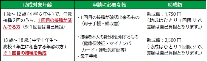 事前に保健センターで申請が必要です。補助対象は注射での接種のみです。