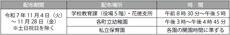 受付場所・時間:学校教育課(役場5階)、花徳支所 午前8時30分~午後5時(土日祝日を除く)