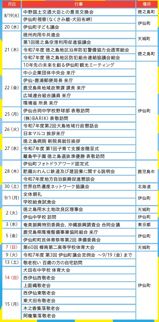 くらし 町長の動き 8/13 前の記事 次の記事 発行日 : 2025年10月01日 自治体名 : 鹿児島県伊仙町 広報紙名 : 広報いせん 令和7年10月号 伊仙町長の1ヵ月の主な動静を紹介いたします。 Tweet シェアする 令和7年度コミュニティ助成事業の報告 奄美群島振興開発事業に関する要望活動を行いました。