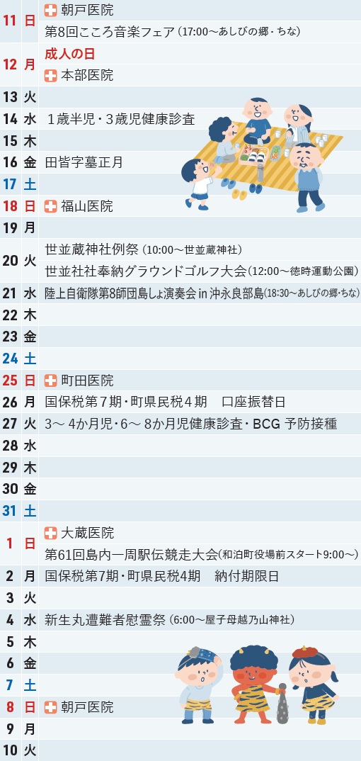 くらし 町民カレンダー 1/11- 2/10 11/16 前の記事 次の記事 発行日 : 2026年01月10日 自治体名 : 鹿児島県知名町 広報紙名 : 広報ちな 2026年1月号 Tweet シェアする 話題の本 入荷しました 今月のいきいき教室