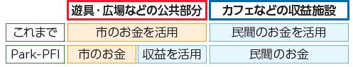 Park-PFIは、公園の整備や運営に民間の資金とアイデア、ノウハウを活かす新しい制度です。この制度を活用することで、市の財政負担を軽減しながら、遊具・広場やカフェといった魅力的な施設を公園に整備することができます。
