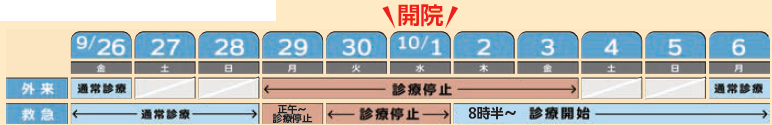 新病院棟は令和7年10月1日に開院予定です。開院に伴う移転業務のため、外来および救急診療を制限いたします。救急診療は10月2日(木)8時半より、外来診療は10月6日(月)より再開します。