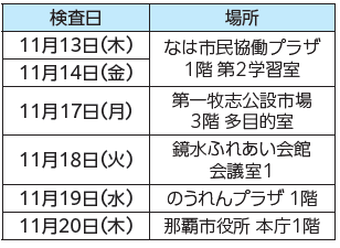 検査の日程・場所は次の通りです。
