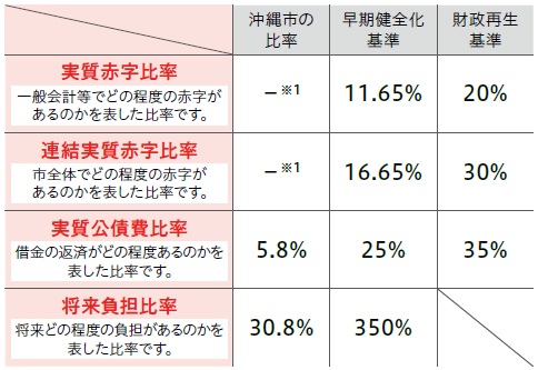 令和6年度決算に基づく沖縄市の「健全化判断比率」及び「資金不足比率」は、すべての指標において「早期健全化基準」及び「経営健全化基準」を下回っております。