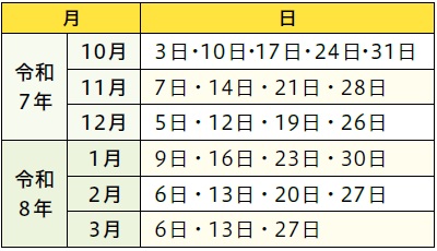 毎週金曜日 午前9時~11時、午後1時~4時まで