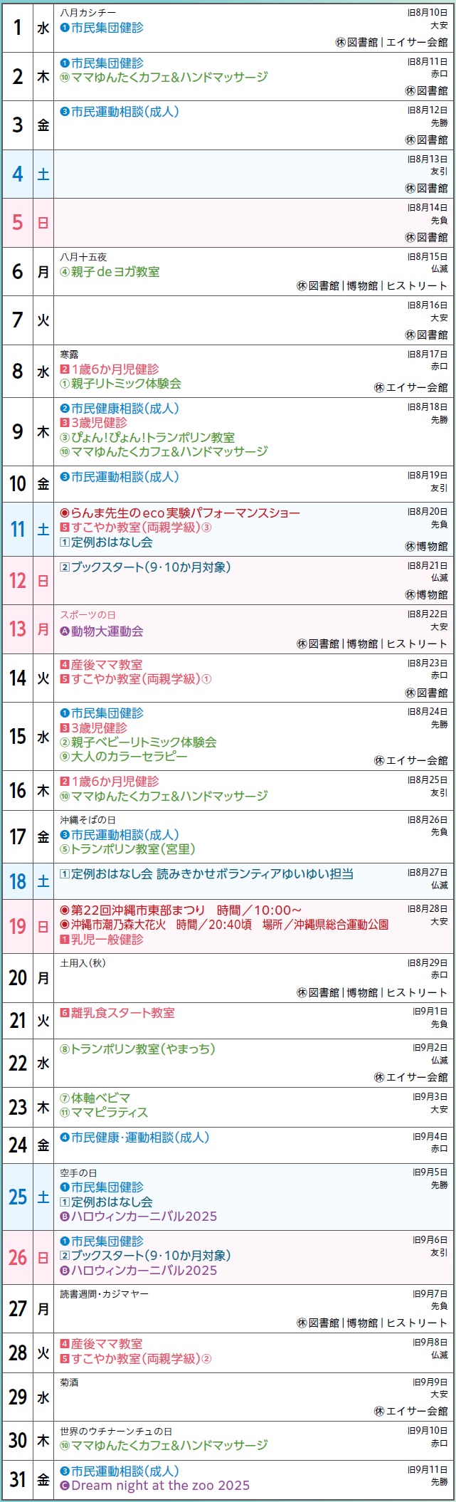 くらし 市民カレンダー 2025年10月(1) 16/37 前の記事 次の記事 発行日 : 2025年10月01日 自治体名 : 沖縄県沖縄市 広報紙名 : 広報おきなわ 2025年10月号 ※掲載情報(日時等)は変更になる場合があります。あらかじめご了承ください。 Tweet シェアする [連載コラム]こちら沖縄市立郷土博物館 市民カレンダー 2025年10月(2)