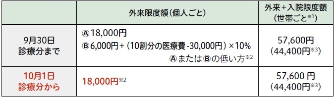 これにより、10月1日以降の診療分からは、2割負担の方の1か月あたりの自己負担上限額が右記の表のとおり変更となります。