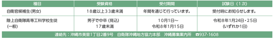 しごと 自衛官等募集のご案内 25/28 前の記事 次の記事 発行日 : 2025年12月01日 自治体名 : 沖縄県うるま市 広報紙名 : 広報うるま 令和7年12月1日号 ●募集種目 連絡先:沖縄市美里1丁目2番9号 自衛隊沖縄地方協力本部 沖縄募集案内所 【電話】937-1608 Tweet シェアする マイナンバーカード 夜間・休日窓口 うるま市民各種無料相談のご案内