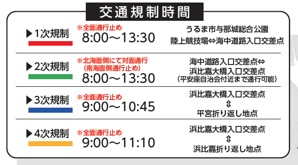 くらし 〔info〕1/18(日)第24回あやはし海中ロードレース大会 交通規制情報 13/27 前の記事 次の記事 発行日 : 2026年01月01日 自治体名 : 沖縄県うるま市 広報紙名 : 広報うるま 令和8年1月1日号 ▼交通規制時間 ※地図は本紙またはPDFをご覧ください。 問合せ:観光・スポーツ課 【電話】923-7612 Tweet シェアする 〔info〕セグロウリミバエの緊急防除が令和9年3月末まで延長 健やかな未来へ進む私たちの20年~健康づくりの成果とこれから~[第2弾]