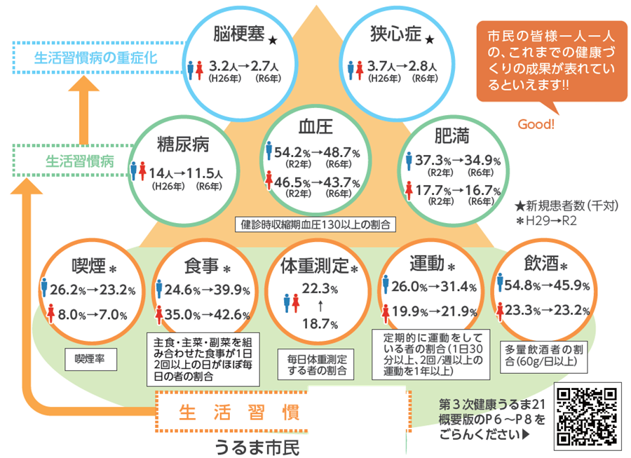 うるま市では20年間、市民や関係者の皆様と共に『健康寿命をのばす』ことを目標に、さまざまな取組みを行ってきました。その結果、健康寿命は男女とものびています。また、65歳未満死亡(早世:若くして亡くなること)も男女ともに減少しています。