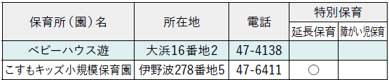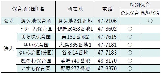 保育所(園)…子育て支援課 子育て支援班【電話】0980-47-2180