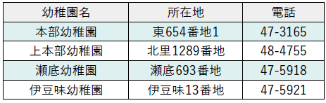 幼稚園…本部町教育委員会 教育庶務班【電話】0980-47-2206