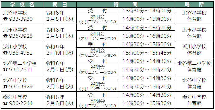 令和8年度に町立小中学校に新入学される児童生徒を対象に以下のとおり各学校でオリエンテーション及び入学受付を実施します。