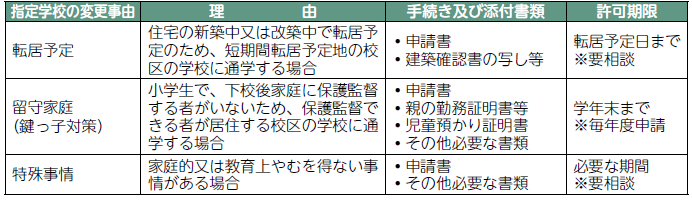 以下の事由に該当する場合は、所定の手続きを行って頂くことで指定学校の変更ができます。
