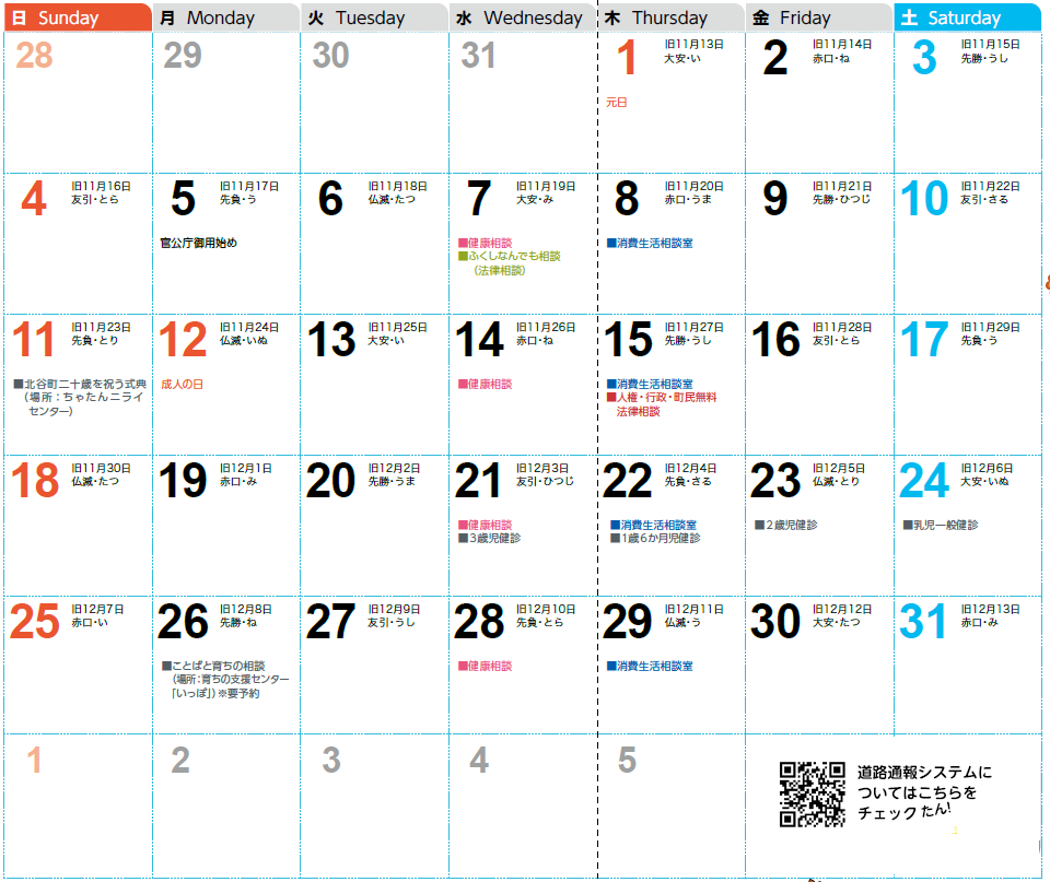 くらし 町民カレンダー 16/45 前の記事 次の記事 発行日 : 2026年01月01日 自治体名 : 沖縄県北谷町 広報紙名 : 広報ちゃたん 2026年1月号 2026(令和8)年 1 JANUARY 睦月 Tweet シェアする 【地域フラッシュ】ニライの都市 北谷町 フリーダイヤル