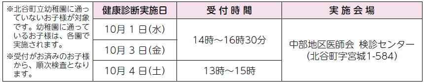 ・「健康診断通知書(9月下旬頃に郵送されます)」と「母子健康手帳」を忘れずに持参してください。