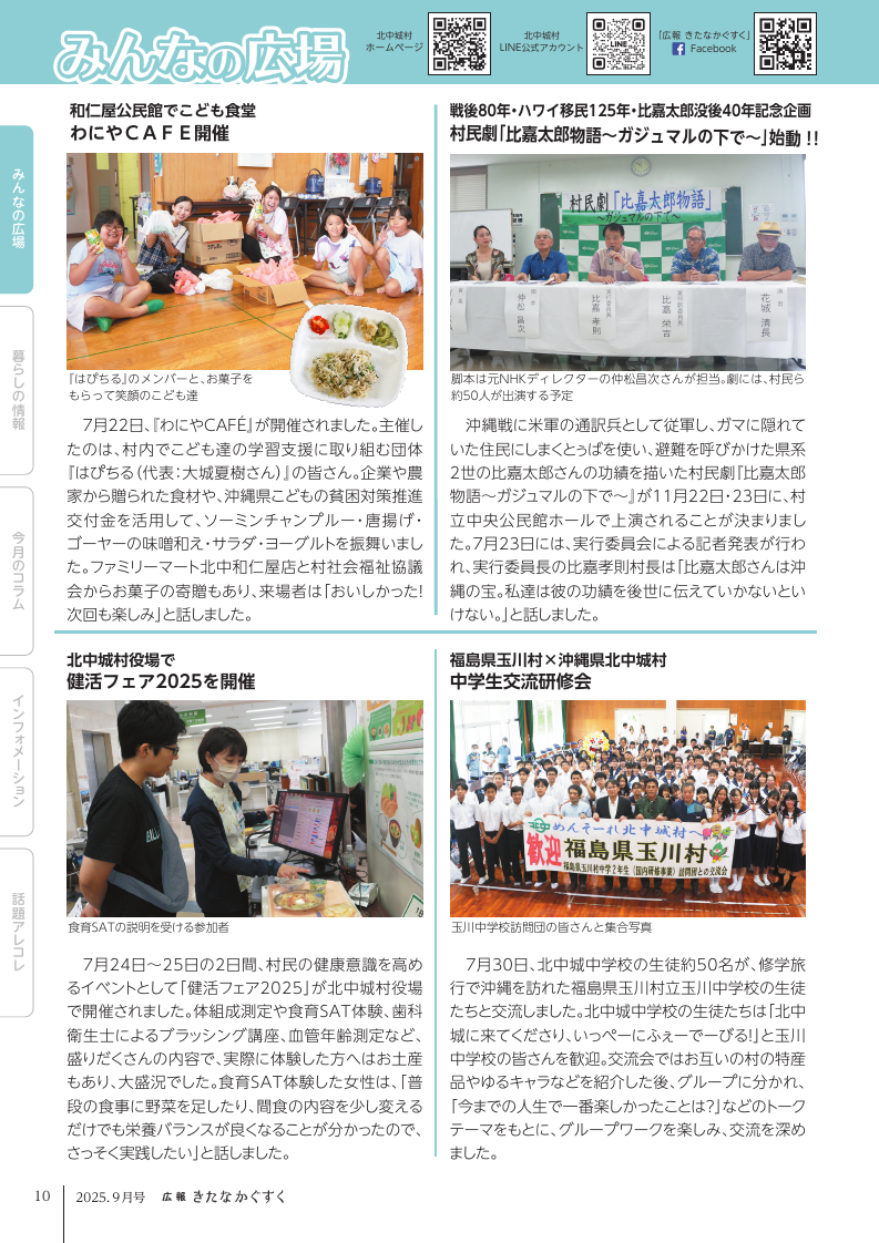 子育て 広報きたなかぐすく 2025年9月号 P.10 10/28 前の記事 次の記事 発行日 : 2025年08月25日 自治体名 : 沖縄県北中城村 広報紙名 : 広報きたなかぐすく 2025年9月号 Tweet シェアする 広報きたなかぐすく 2025年9月号 P.9 広報きたなかぐすく 2025年9月号 P.11