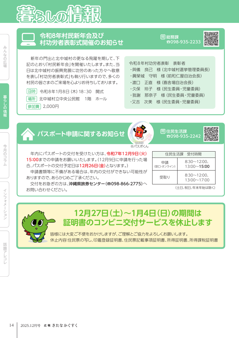 くらし 広報きたなかぐすく 2025年12月号 P.14 14/32 前の記事 次の記事 発行日 : 2025年11月25日 自治体名 : 沖縄県北中城村 広報紙名 : 広報きたなかぐすく 2025年12月号 Tweet シェアする 広報きたなかぐすく 2025年12月号 P.13 広報きたなかぐすく 2025年12月号 P.15