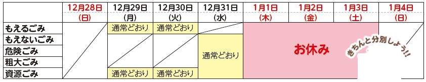 年末年始のごみ収集の日程は、次のとおりとなります。年内は通常どおり収集しますが、年明けの1月1日から1月3日までは、ごみの収集はお休みとなりますので、よろしくお願いします。