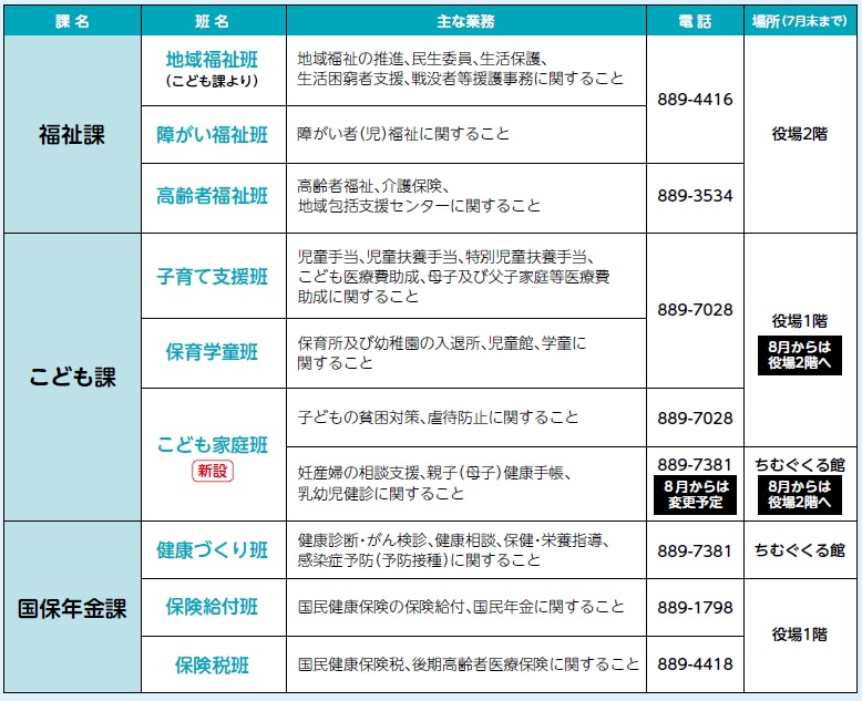 福祉・子育ての部署について4月から下記のとおりとなります。