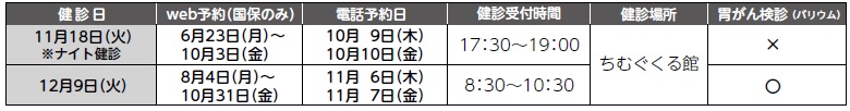 健診は、個別健診・集団健診ともに無料で受診ができます。年度後半は予約が混み合います。早めに受診しましょう。なお、40歳以上の国民健康保険加入者については健診を受診した方へ「おこめ券」を進呈しています。