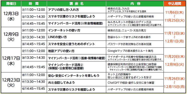 スマートフォンを持っていない、持っているが上手く活用出来ていない方を対象とした講座です。少人数制で丁寧に操作方法を説明します。お気軽にご参加ください。