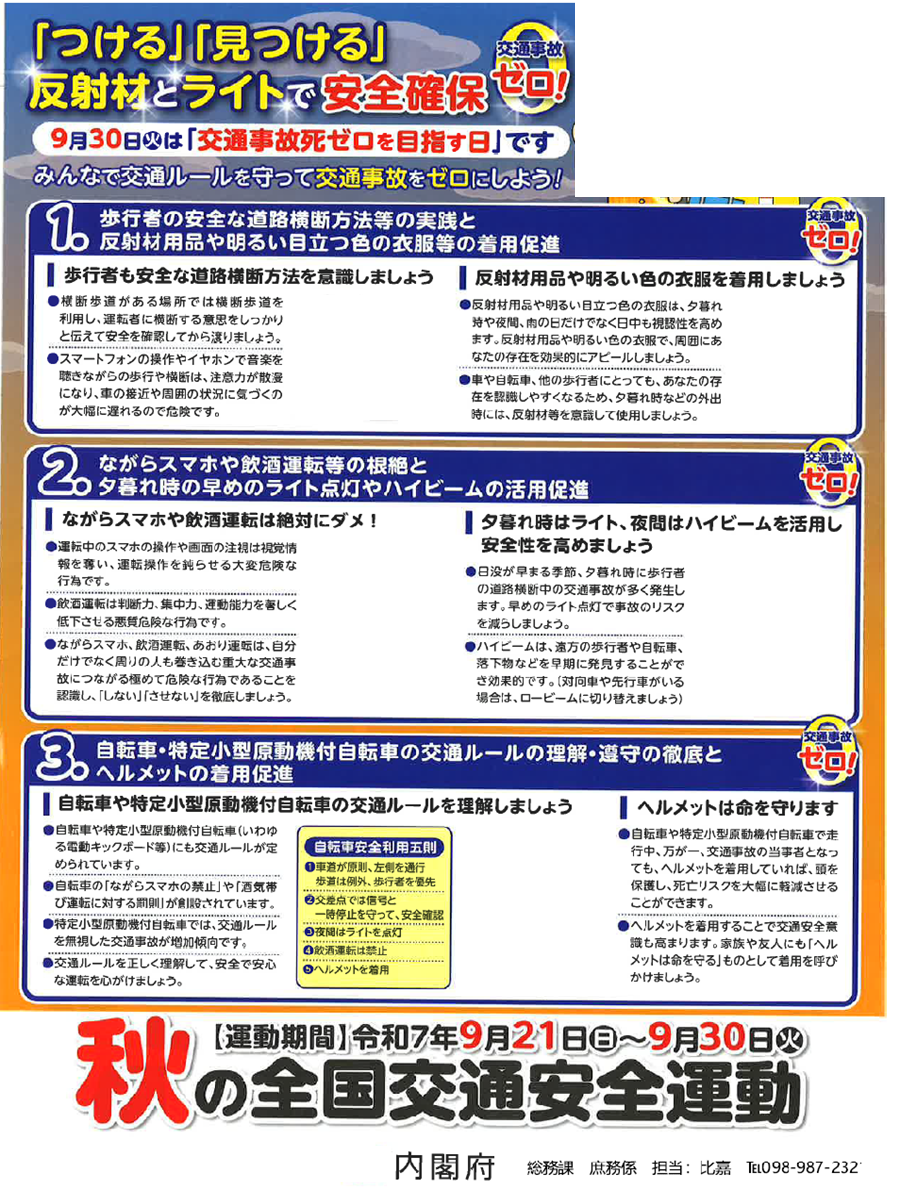くらし 秋の全国交通安全運動[運動期間]令和7年9月21日(日)~9月30日(火) 9/34 前の記事 次の記事 発行日 : 2025年09月03日 自治体名 : 沖縄県渡嘉敷村 広報紙名 : 広報とかしき 令和7年9月号 ※詳細は本紙をご覧ください。 問合せ:総務課 庶務係 担当…比嘉 【電話】098-987-2321 Tweet シェアする 船舶課より 5年に一度、全員参加の統計調査 国勢調査2025