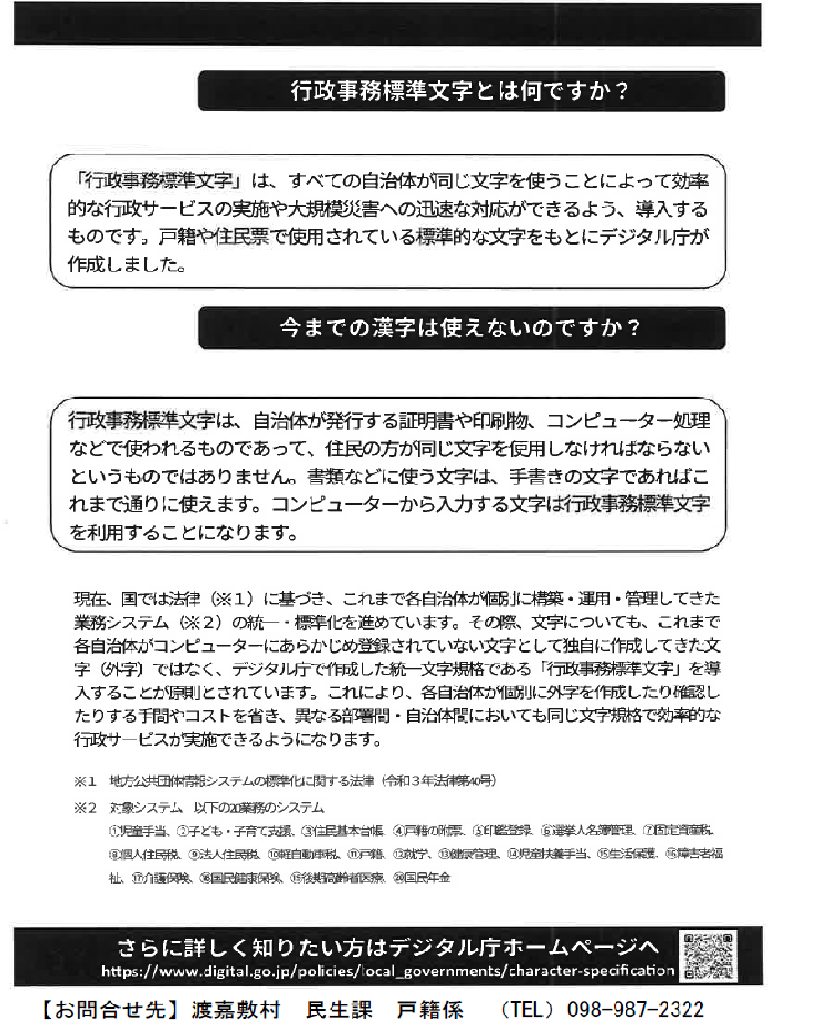 くらし 行政事務標準文字導入についてのご案内 16/34 前の記事 次の記事 発行日 : 2025年09月03日 自治体名 : 沖縄県渡嘉敷村 広報紙名 : 広報とかしき 令和7年9月号 ※詳細は本紙をご覧ください。 お問合せ先:渡嘉敷村 民生課 戸籍係 【電話】098-987-2322 Tweet シェアする マイナンバーカード申請・受取等 休日開庁のお知らせ 令和7年度「住民健診」のお知らせ