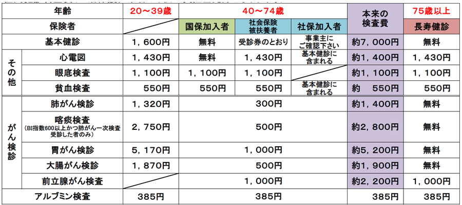 ■住民健診料金表(生活保護世帯者は、個人負担金免除となります。)