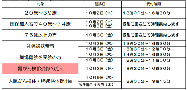 ※胃がん検診の受診希望者は、10月3日(木)に基本健診・がん検診等をまとめて受診して下さい。