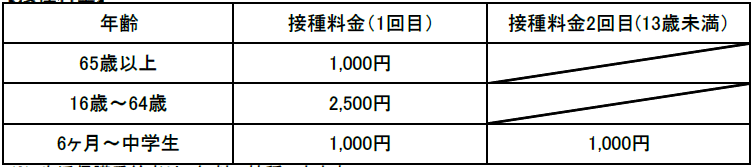 持参する物:健康手帳、親子(母子)健康手帳(中学生以下)、接種料金